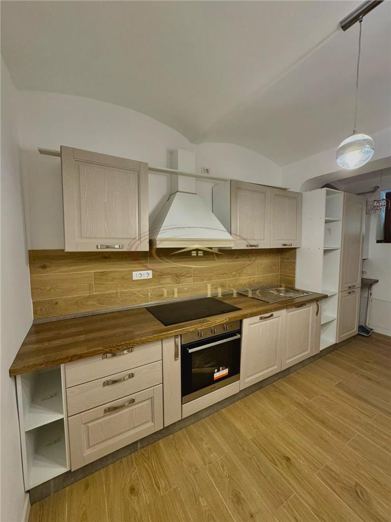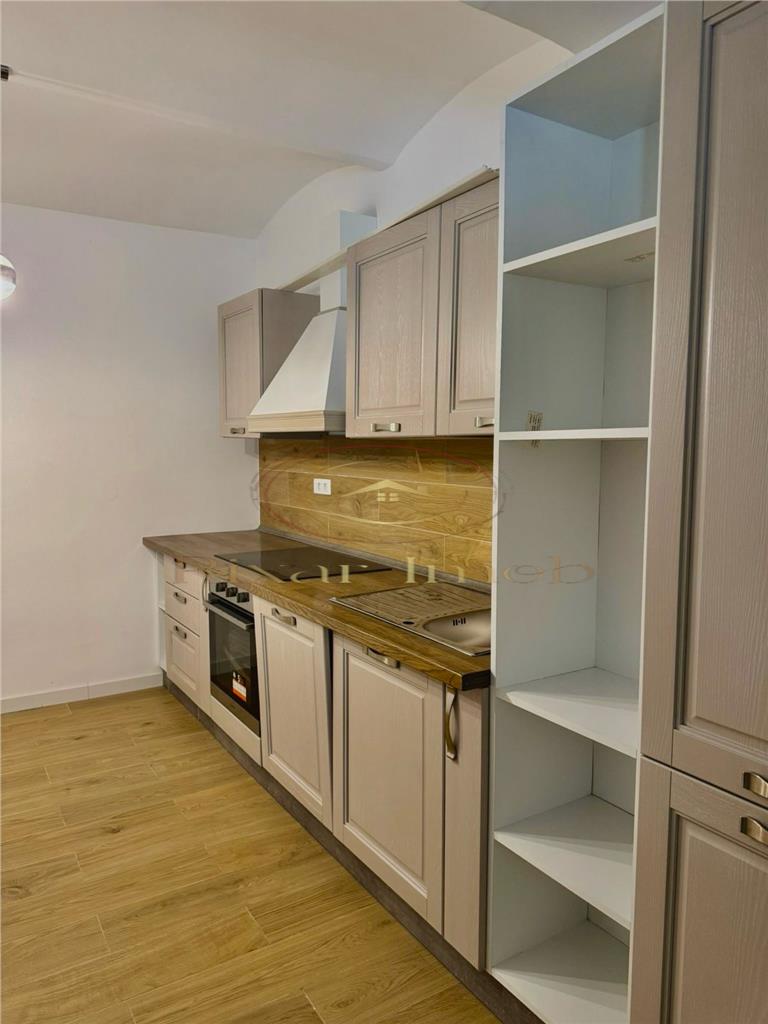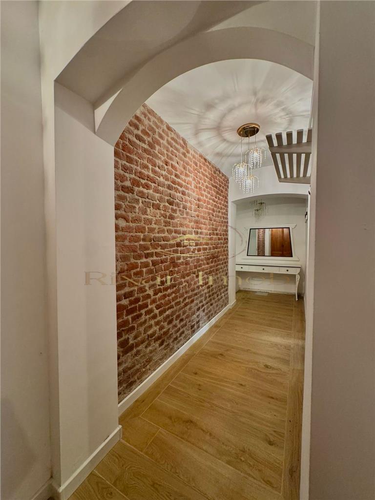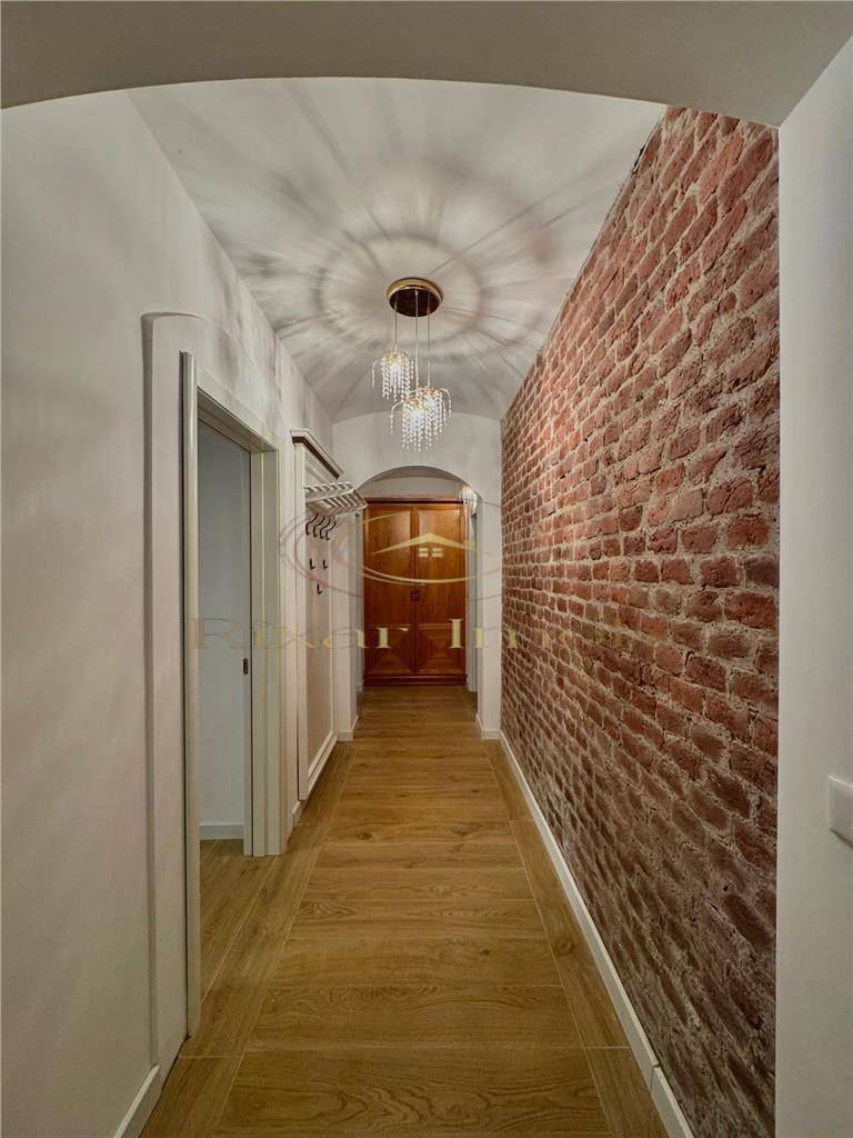 Compartimentarea include living, bucătărie complet echipată, dormitor spațios, baie, hol și un spațiu de depozitare separat inclus în preț. Holul păstrează bolta originală din cărămidă aparentă, un detaliu care conferă apartamentului un aspect aparte. Finisajele sunt moderne peste tot: pardoseli gresie efect lemn, zugrăveli proaspete, instalații electrice și sanitare refăcute complet. Baia este finisată cu gresie efect lemn și dotată cu toaletă suspendată și bideu.